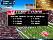 Gameplay is simple. Step 1: select the distance to want to attempt to kick the fieldgoal. Step 2: Hit the space bar once to set the power meter going. Step 3: Hit the space bar a second time to select your kick power and start the directional arrow moving. Step 4: Hit the space bar one last time to select the direction for your kick and set the ball flying. Point are awarded for each successful kick. The longer the kick, the more points are awarded. The player gets to attempt five kicks and all the points are totaled to calculate the final score.